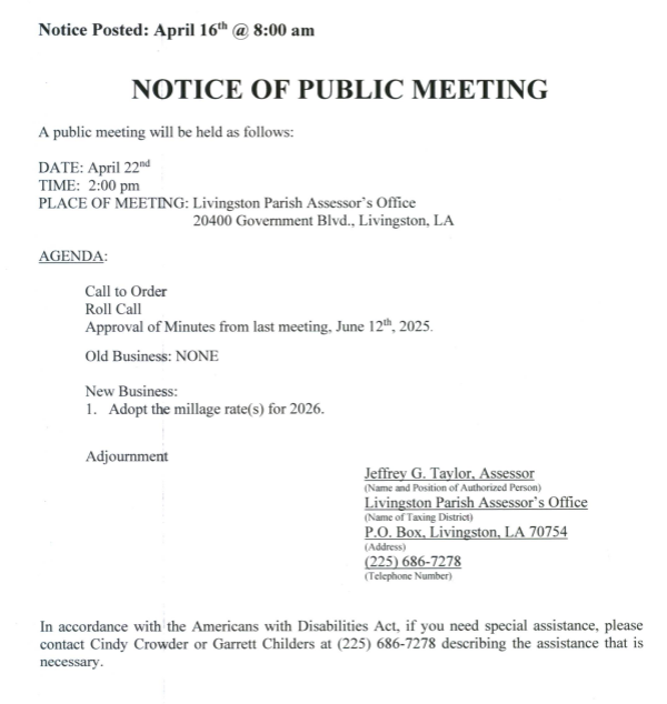 No. The Assessor does not send out tax notices or collect the taxes. The Sheriff is the tax collector for the parish. You can click the tab above to be directed to the Sheriff’s website for payment, send your payment in by mail or pay in person at the Courthouse located at 20300 Government Blvd., Livingston, La. 70754